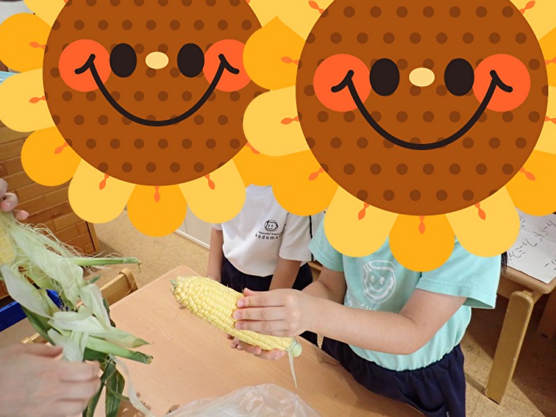 先日、5歳児の子どもたちがとうもろこしの皮むきをしました♪