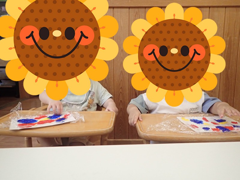 0歳児の子どもたちが絵の具で遊んでいました♪